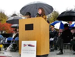 ![]() Diane Carlson Evans addresses an audience at the Vietnam Veteran's Memorial Wall in Washington, D.C., on Veterans Day, Nov. 11, 2009. | |