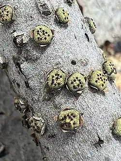Diatrype virescens grows from under the bark, pushing it aside in a conspicuous manner. The fruiting body is yellowish-green, and ranges 2.5-4 mm in diameter. The color fades into brown and black and soon can look similar to Biscogniauxia marginata. There are usually several sulcate (grooved) ostioles per fruiting body.[1]