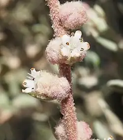 Dicrastylis costelloi is a shrub, growing to about 40 cm high on red sands. Its stems are roughly circular in cross section with no peltate scales. The opposite and entire leaves are 8–25 mm long by 3.2–6 mm wide, and have branched (dendritic) hairs. There are bracteoles (1–2 mm long), and bracts (5–9 mm long. The flowers are sessile. The calyx has five lobes (1.5 mm long), covered in dendritic hairs, and the white or cream corolla is 4.5–5 mm long, with no dots or stripes in its throat. There are five stamens. In Western Australia it flowers in October.[5]