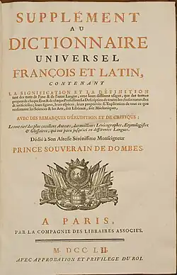 The Dictionnaire de Trévoux (French pronunciation: [diksjɔnɛːʁ də tʁevu]), also titled Dictionnaire universel françois et latin, is a French dictionary that appeared in several editions from 1704 to 1771. It was unofficially and then officially nicknamed Dictionnaire de Trévoux because of its original publication in the town of Trévoux (near Lyon, France)[1] Throughout the 18th century, it was widely assumed to be directed by the Jesuits, a supposition supported by at least some modern scholars.[2]