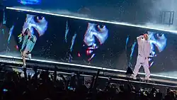 In August 2019, a video of Die Antwoord filmed by Crossman in 2012 resurfaced, showing the duo at Future Music Festival physically assaulting Hercules and Love Affair frontman Andy Butler, who is a gay man, and chasing after him while yelling, "Run, faggot, run," before telling a fabricated story to festival security about Butler groping Visser in a bathroom stall.[165][166] Soon after the video resurfaced, they were dropped from the lineups of the American music festivals Life is Beautiful, Louder Than Life, and Riot Fest, the last of which saw them replaced with Wu-Tang Clan.[167][168] Ninja wrote in a Facebook post that Crossman "cleverly edited" the video to make it look like a homophobic hate crime despite his own participation in assaulting Butler.[169] Die Antwoord's House of Zef Tour, which was scheduled in the United States from September to October 2019, was postponed in September 2019, ostensibly due to their occupation with other projects.[170][171] Chelsey Norris of the Dallas Observer surmised that the tour's postponement was instead due to the resurfaced video involving Butler.[164]