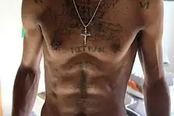 Vogue's Liana Satenstein likened Ninja's fashion style to that of a "weird dad", describing it as "laze-about, slightly sleazy, and sand-strewn".[202] Visser is also known for her haircut, a bleach blond mullet with short bangs, which she has said inspired Die Antwoord's overall visual direction after Ninja first cut it for her in 2009.[203][204][12] Ninja is known for his tattoos, which are inspired by prison tattoos and Cape Flats gang tattoos and are mostly stick and pokes done by South African tattoo artist Tyler B. Murphy.[205][206][207] Ninja stated in 2010 that their artistic style is inspired by "the art of children, and the criminally insane" because of a lack of "that hard barrier between their conscious and subconscious minds".[208]
