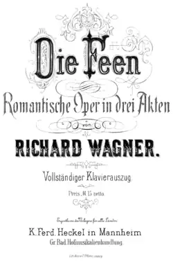 Die Feen (German: [diː feːn], The Fairies) is an opera in three acts by Richard Wagner. The German libretto was written by the composer after Carlo Gozzi's La donna serpente.[1] Die Feen was Wagner's first completed opera, but remained unperformed in his lifetime. It has never established itself firmly in the operatic repertory although it receives occasional performances, on stage or in concert, most often in Germany. The opera is available on CD and in a heavily cut, adapted-for-children version, DVD.