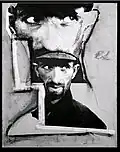To make the canvases in Die Plage, Gaber used a range of techniques including collage, photomontage, painting, xerographic manipulation, pastel, and charcoal.[6][7] Razor blades and scissors were Gaber's primary tools. Although it was available, Gaber did not use photoshop in his alterations. Gaber gathered historic images and iconography from books, archives, and magazines; he then xeroxed, cut, spliced, and adhered images to the canvas with gesso or a heat gun.[8] He gathered these materials from libraries and archives in the U.S., and from his many trips to Germany. The canvases, each measuring 16 by 20 inches, are framed with thin, light wood.[9] Aside from the occasional application of blue paint, Gaber confined all of the other 4,200 canvases to a black-and-white palette.