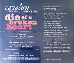 - ^ Evans Price, Deborah (June 12, 2004). Paoletta, Michael (ed.). "Billboard Picks: Singles | Carolyn Dawn Johnson: "Die of a Broken Heart"". Billboard. Vol. 116, no. 24. Nielsen Business Media. p. 35. ISSN 0006-2510. Retrieved September 25, 2024 – via Google Books.