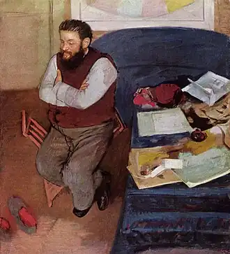 He spent time with Manet, and with Degas who painted two portraits of him in 1879.[9] Martelli's closest friendship among the Impressionists was with Pissarro who, at Martelli's urging, exhibited two of his paintings in the Florence Promotrice of 1879. That they were poorly received, even by the Macchiaioli, was a disappointment to Martelli.[10]
