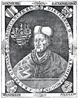 Diether von Isenburg (c. 1412 – 7 May 1482) was twice Archbishop (1459–1461 and 1475–1482) and founder of the University of Mainz. As Archbishop of Mainz, he was ex officio Elector and Lord Chancellor of Germany.[1]