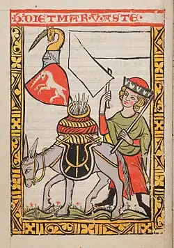 Dietmar von Aste: Alternative names used in the early literature for Dietmar von Aist are Dietmar von Aste or von Ast, as depicted above in the "Konstanz-Weingartner Liederhandschrift" (written around 1310-1320 in the monastery St. Martin at Weingarten near Ravensburg). The unicorn served as heraldic animal for Dietmar.