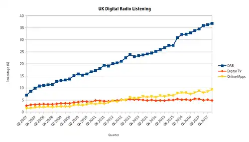 In the UK, 65.8% of all radio listening hours by the third quarter of 2021 were through digital platforms, with DAB making up the majority of digital radio listening (65.3% of digital radio listening).[5] In the first quarter of 2020, 66.7% of UK people aged 15+ claimed to have access to a DAB radio set at home.[6]