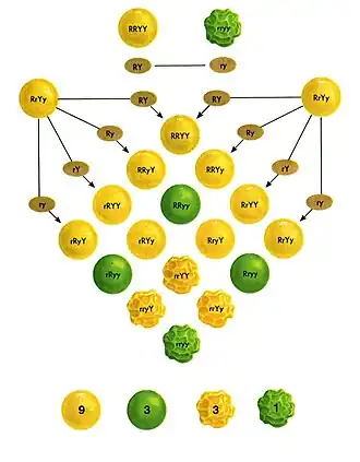 Gregor Mendel was an Austrian-Czech monk who bred peas plants in his monastery garden and compared the offspring to figure out inheritance of traits from 1856-1863.[2] He first started looking at individual traits, but began to look at two distinct traits in the same plant. In his first experiment, he looked at the two distinct traits of pea color (yellow or green) and pea shape (round or wrinkled).[3] He applied the same rules of a monohybrid cross to create the dihybrid cross. From these experiments, he determined the phenotypic ratio (9:3:3:1) seen in dihybrid cross for a heterozygous cross.[1]