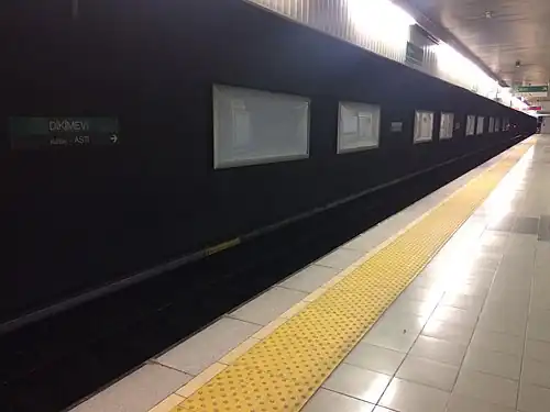 Dikimevi is an underground station and the eastern terminus of the Ankaray line of the Ankara Metro in Çankaya.[1] It is located under Cemal Gürsel Avenue in Cebeci, three blocks south of Cebeci station. Dikimevi station consists of two side platforms and opened on 30 August 1996, together with the Ankaray line.[2] The line was originally planned to be extended further east in Mamak, however these plans never took place.[2]