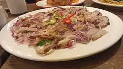 Dinakdakan, also known as warekwarek, is a Filipino dish consisting of various pork head offal, red onions, siling haba or siling labuyo chilis, ginger, black peppercorns, calamansi juice, and bay leaves. The pork parts are first boiled in the aromatics for an hour or so until tender, and then further grilled until lightly charred. They are chopped into small pieces and served in a creamy sauce traditionally made from mashed cooked pig's brain, though this is commonly substituted with mayonnaise. The pork offal used commonly includes pork jowls (maskara), pork collar, and ears. Sometimes pork tongue, liver, stomach, and intestines are also included. Dinakdakan is most commonly served as pulutan, appetizers that are eaten with beer or other alcoholic drinks. It can also be eaten with rice.[1][2][3][4][5]