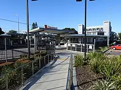 Dinmore railway station (27°35′46″S 152°50′01″E / 27.5962°S 152.8335°E) provides access to regular Queensland Rail City network services to Brisbane, Ipswich and Rosewood via Ipswich.[25] As well, regular bus services are available throughout. Dinmore Train station provides a hub for commuters coming from the Warrego Highway. A new car park was built at the station to allow for a substantial access point for driving commuters.