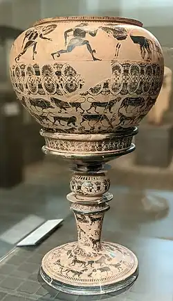 The British Museum possesses two remarkable dinoi of the painter and potter Sophilos, who was the first Attic potter to sign his works. On the stands of these two dinoi, c. 580 BC, the marriage of Peleus and Thetis is depicted in black-figure style. These examples show the same Corinthian influence which is found on the works of the Gorgon Painter in his decoration of the vases with various kinds of animals. However, the stands are much larger and the vases are proportionately much smaller.[3]