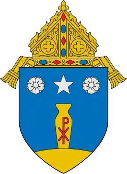 The diocesan arms consists of a blue field on which is seen, issuing from the base of the shield, a golden (yellow) hill. On this hill is a golden (yellow) vase that is charged with Chi Rho in red. Above the vase are a silver (white) star between two silver (white) roses.