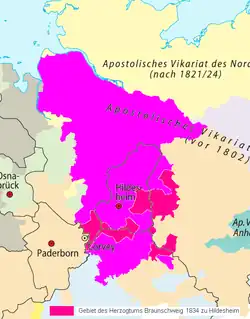 Hannover's cession of land for Bremerhaven in 1827 to the prevailingly Reformed Bremen State did not alter the diocesan ambit. In 1834 the prevailingly Lutheran Duchy of Brunswick left the Apostolic Vicariate of Anhalt and agreed to extend Hildesheim's ambit to the ducal territory.[2] Thus the diocese covered areas in three sovereign states, with all of which and thus all the diocesan area becoming part of united Germany in 1871.