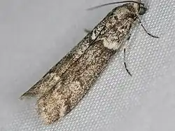 The wingspan is 21โ27 mm. The forewings are dark gray with a fine, sparse, white dusting, making the general color a dark ash gray. The hindwings are white, but smoky at the apex and somewhat along the termen.[2]