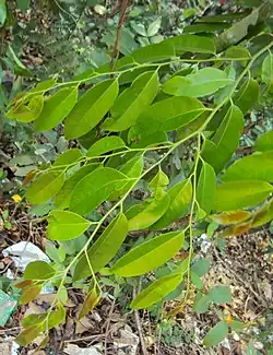 The bark of D. candolleana is smooth, dark, and blaze-reddish in color. Branchlets are terete and show adpressed hairs when young. Leaves are simple, alternate, distichous; petioles are 0.6-1.1 cm long and canaliculate. Leaves are hairy when young, and glabrous when mature. Lamina is about 6-18 x 3.5-7.5 cm in length, shape is oblong to elliptic-oblong.