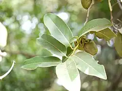 Evergreen trees up to 16 m tall, with smooth, black bark. The blaze is a dull orange. The young branchlets are cylindrical, covered by black, sooty hairs. The tree's leaves are simple, alternate, distichous, with petioles about 0.5-1.1 cm long, flat, glabrous. The leaf blade is about 9 to 27 cm long by 3.5–8 cm wide, and has an entire margin and a raised midrib. The leaf shape is usually narrow elliptic-oblong to lanceolate, with acute to acuminate apex ending in a blunt tip. The leaf base is acute to rounded. The leaf is thick (coriaceous) with minute pellucid dots beneath. The venation, with 6-9 pairs of secondary nerves, is strongly and closely reticulate on both surfaces.[5]