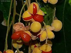 The fruit is very similar to that of D. diphyllostegia, a 2- or 3-lobed capsule measuring up to 1.6 cm (0.63 in) long by 3 cm (1.2 in) wide with one seed per lobe, which is enveloped in an orange or red aril.[4][5][6]