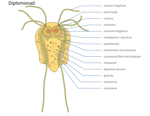 The diplomonads (Greek for "two units")[2] are a group of flagellates, most of which are parasitic. They include Giardia duodenalis, which causes giardiasis in humans.[3] They are placed among the metamonads, and appear to be particularly close relatives of the retortamonads.