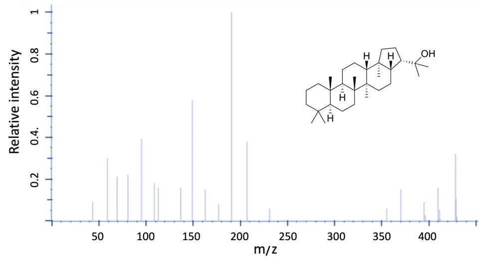 A positive identification is often obtained by comparison with extracts from known bacterial producers of diplopterol, such as Methylococcus capsulatus.[10] A literature mass spectrum for diplopterol is shown, along with a figure from a recent report which examines several hopanoid biomarkers in lipid extracts from Rhodopseudomonas palustris.[10]