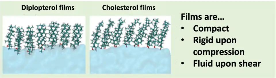 - ^ a b Mangiarotti, Augustin; Galassi, Vanesa V.; Puentes, Elida N.; Oliveira, Rafael G.; Del Popolo, Mario G.; Wilke, Natalia (2019). "Hopanoids Like Sterols Form Compact but Fluid Films". Langmuir. 36 (30): 9848–9857. doi:10.1021/acs.langmuir.9b01641. PMID 31268719.