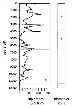 A recent report in which diplopterol was utilized as a key biomarker examines the lipid composition in sediments from Lake Albano, central Italy.[14] The authors propose that the relative distribution of diplopterol and diploptene provides valuable insight into the oxygen content in the water column during different periods in the Holocene.[14] The authors report a relatively high concentration of diplopterol in the young Holocene. They suggest that since other hopanoids are present in almost all bacteria, whereas diplopterol is also produced by some protozoa, periods of high diplopterol abundance likely indicate lower oxygen contents.