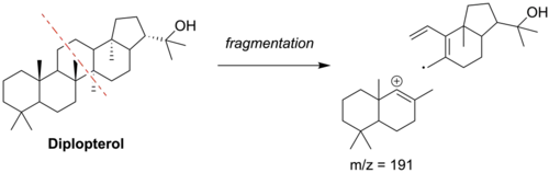Some of the most useful techniques for analysis of diplopterol are gas chromatography-mass spectrometry (GC-MS), and GC-MS-MS.[10] These techniques allow for the identification of compounds based on the mass to charge ratios (m/z) of their ions. Whereas many polyfunctionalized hopanes can only be analyzed by liquid chromatography-mass spectrometry (LC-MS), diplopterol and similar compounds with short side chains are fairly easily volatilized.[1] In general, hopanes display a key spectral fragment with m/z 191, corresponding to cleavage across the central C ring.[1] In the case of diplopterol, the alcohol group is often derivatized, either to a trimethylsilyl (TMS) or acetate group.[2] If purification is necessary, diplopterol can typically be separated from other biomarkers by polarity via column chromatography or preparatory thin-layer chromatography (TLC).[2]