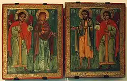 Deesis, 17th-century icon. Left to right: Archangel Michael, Theotokos, John the Baptist, Archangel Gabriel (Historical Museum in Sanok, Poland).