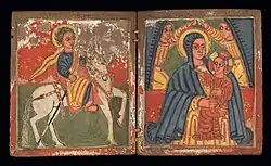 Ethiopian Orthodox wooden diptych of St. Mary and the infant Jesus with archangels above them. St. George appears on a white horse on the left. (Late 16th-early 17th century)