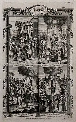 The martyrdom of Dirick Carver (top left), depicted by Garnet Terry for an edition of Foxe's Book of Martyrs