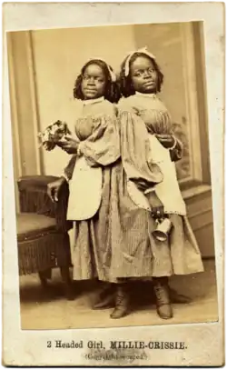 An example of disabled slaves who were subjected to harsh treatment were Christine-Millie McKoy, twins that were born conjoined at the hip.[4] Before they were two years old, they were sold to a Joseph P. Smith who showcased the girls in carnivals and other events while also allowing them to be evaluated by doctors.[4] Medical officials were obsessed with the twins' reproductive organs and anuses which led to their "digital rape."[2][4] Throughout their life, the McKoy twins would be showcased all across the United States as well as Europe, kidnapped multiple times, and medically mishandled by medical professionals.[4]