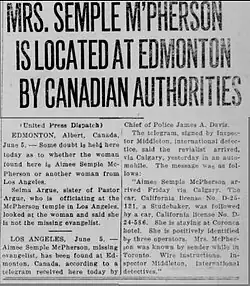 For a time Mildred Kennedy, McPherson's mother, offered a $25,000 (equivalent to $444,032 in 2024) reward for information leading McPherson's return. During the period of her disappearance, while there were "various and voluminous claims," of McPherson sightings, none at all came from Carmel-by-the-Sea, a California town that would later dominate the headlines for such sightings. After the reward expired, on June 5, newspaper headlines announced McPherson had been found in Canada, as given by Inspector Middleton of the Royal Northwest Mounted Police, which shook up Los Angeles. Upon receiving the news, Kennedy wanted her daughter returned to her as soon as possible.[10][11]