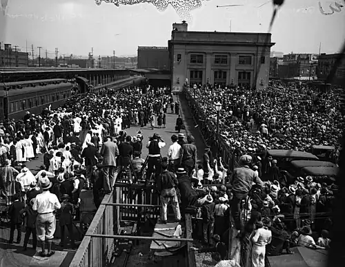 Following her return to Los Angeles from Douglas, McPherson was greeted at the train station by 30,000–50,000 people, more than for almost any other personage.[31] The parade back to the Temple even elicited a greater turnout than President Woodrow Wilson's visit to Los Angeles in 1919, attesting to her popularity and the growing influence of mass media coverage.[32][33][31]