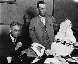 In December, Ormiston was found by newsmen, living quietly in Harrisburg, Pennsylvania. Papers described him being taken without resistance by police while sitting at a typewriter.[120] A Harrisburg detective characterized the affair as a "publicity stunt," but declined to elaborate. Among Ormiston's personal effects were five diplomas from five radio schools and letters implying he had a wife in Brazil.[100] He was escorted to Chicago, Illinois with intent to be transported to Los Angeles. Asa Keyes said he would “do everything in his power” to extradite Ormiston. However, he did not stop in Chicago to pick him up though he traveled near there on his way to and from Washington, D.C. The Chicago police chief denounced Keyes for "yelling to high heaven for his apprehension" but when the fugitive Ormiston was "within reach," Keyes called Ormiston of minimal importance.[102][121] The Chicago police chief lacked proper documents for further action, and to the annoyance of Los Angeles officials, Ormiston was released. When the warrant was finally obtained, Chicago police were ready to transport their expected prisoner, Ormiston, to Los Angeles [122] In the meantime, Ormiston appeared in Los Angeles surrounded by newsmen and was greeted by the entire prosecution staff. Affably, amidst the flashbulbs of photographers, Ormiston accepted his served warrant. His bond was set at $2,500.[123]