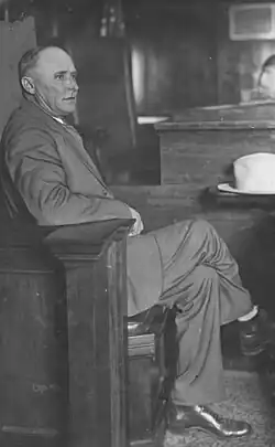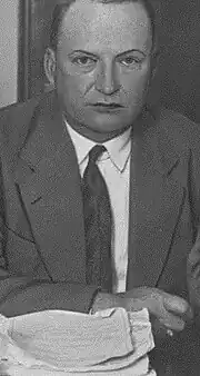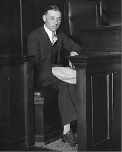 As McPherson's accused lover who allegedly assisted in the kidnapping fraud, Ormiston was a prominent defendant in the 1926 grand jury inquiry. He had been McPherson's radio operator and was crucial in getting her programs on the air. He was described as about 5 feet 11 inches (180 cm) tall, bald, slender, and good-natured with a wonderful disposition.[97] He also had a distinctive limp that frequently identified him more than any other feature. During the time of McPherson's disappearance, newspapers freely speculated about him and the Los Angeles DA office initiated various manhunts accompanied by front-page headlines, searching for the elusive radioman.[98] Though the Los Angeles prosecution and two city newspapers spent lavishly to romantically connect McPherson with Ormiston, no conclusive evidence that they were lovers could be uncovered.[99] To some law enforcement officials outside of Los Angeles, the pursuit of Ormiston was done for publicity.[100][101][102]