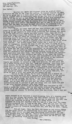 Several ransom demands were received but determined to be fraudulent. One was a handwritten note by the "Revengers" who wanted $500,000 (equivalent to $8,880,639 in 2024). Another for $25,000 was conveyed by a blind lawyer, Russell A. McKinley, who claimed contact with the kidnappers.[14][15][16] A lengthy and poorly typewritten ransom letter from the "Avengers" arrived around June 19 demanding $500,000[17] in return for not selling McPherson into "white slavery"; the "kidnappers" said McPherson annoyed them with her incessant preaching. Kennedy believed these demands to be hoaxes and McPherson dead.[18]