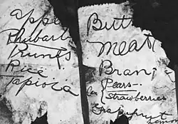 The Carmel cottage was further checked for fingerprints, but none belonging to McPherson were recovered. Two grocery slips found in the yard of the cottage were studied by a police handwriting expert and determined to be McPherson's penmanship. While the original slips later mysteriously disappeared from the courtroom, photostat copies were available.[83] The defense had a handwriting expert of their own and claimed to have a photograph of the well publicized slips which differed from the police photostat. They contended the reproduction "had been maliciously tampered with" to resemble McPherson's handwriting.[84] The slips' suspicious origin was also questioned. The original slips would have been in the yard for two months, surviving dew, fog, and lawn maintenance before their discovery by deputy DA Ryan.[85] Frustrated with his own witnesses and evidence, at the close of one of the day's sessions, prosecutor Keyes disgustedly threw a stool top after the departing courtroom crowd.[86]