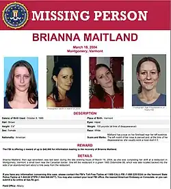 - ^ Keays, Alan J.; Derby, Diane (2024-03-19). "20 years after Brianna Maitland's disappearance, investigators hope reward money will bring new clues". vtdigger. Vermont Journalism Trust, Ltd. Retrieved 2025-07-11.