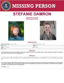 - ^ "The FBI and the Maine State Police Announce $15,000 Reward for Missing Aroostook County Teenager Stefanie Damron". Federal Bureau of Investigation. Retrieved January 15, 2025.
