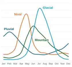Mader denoted only those regimes with nival peaks corresponding to transitional nival as 'nivo-pluvial'.[32] Hrvatin in his distinction also differentiated between 'high mountain Alpine nivo-pluvial regime' and 'medium mountain Alpine nivo-pluvial regime', the first showing significant difference between the minima and the other not, although some regimes in his classification also have mild nival peaks.[33] In Japan, the pluvial peak is in the summer.