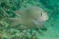 Dischistodus prosopotaenia, also known as honey-head damsel and honey-breast damsel, is a species of damselfish. It is native to the eastern Indian Ocean and western Pacific. It reaches up to 17 centimetres (6.7 in) in length. The fish usually has a white breast, but there is a yellow-breasted variant that also has a black blotch on each side. The fish lives in lagoons and reefs.[2]
