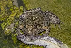 It is on the list of Strictly Protected Fauna of the Council of Europe (Bern Convention).[7] They appear to be endangered by the intensification of agriculture, but populations that live along rivers, seasonal ponds, and swamps seem to be less endangered. Populations from northeast of the Iberian Peninsula could be a threat to some native species of frogs, especially those where they both occur in the same aquatic habitats.[8] In North Africa, it is a very abundant species, especially in the subhumid northern regions, but its presence reaches pre-Saharan oases.[9] Populations on Malta are said to be threatened by a reduction of the ground-water levels.[1] It was introduced several times on the island of Comino, but the introduced Levant water frog (Pelophylax bedriagae) on the Maltese archipelago is a direct competitor of this species. To effectively protect this species, more data are needed about its ecology and biology. D. pictus seems to be associated with man-made water bodies, at least for part of its distribution.