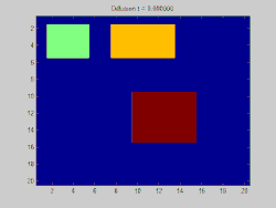 This GIF shows the progression of diffusion, as solved by the graph laplacian technique. A graph is constructed over a grid, where each pixel in the graph is connected to its 8 bordering pixels. Values in the image then diffuse smoothly to their neighbors over time via these connections. This particular image starts off with three strong point values which spill over to their neighbors slowly. The whole system eventually settles out to the same value at equilibrium.