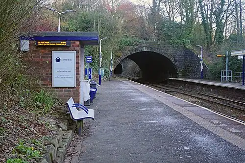Disley railway station serves the village of Disley in Cheshire, England. It is sited 12+1⁄3 miles (19.8 km) south-east of Manchester Piccadilly on the Buxton Line, built by the Stockport, Disley and Whaley Bridge Railway. The station is managed by Northern Trains, which also operates all trains serving it.
