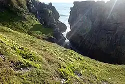 While Disphyma australe is rarely found inland,[5] it is very common at the coast.[13][5] It prefers especially rocky shores,[14] and both subspecies grow on cliff faces, rocks and on gravel and cobble beaches.[5][13] Furthermore, it can also occur in other types of coastal habitats, including salt meadows or estuaries[5][9] and occasionally at the back of sandy beaches.[9] Another place where Disphyma australe grows is near nesting grounds of sea birds, such as near petrel burrows,[5][9] because in contrast to many other plants it can survive high amounts of bird droppings.[9]