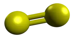 Disulfur is the diatomic molecule with the formula S2.[2] It is analogous to the dioxygen molecule but rarely occurs at room temperature. This violet gas is the dominant species in hot sulfur vapors. S2 is one of the minor components of the atmosphere of Io, which is predominantly composed of SO2.[3] The instability of S2 is usually described in the context of the double bond rule.
