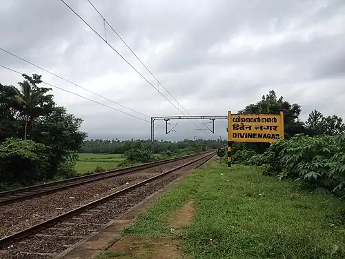 Divine Nagar railway station (Station Code: DINR) falls between Chalakudi and Koratty railway station in the busy Shoranur–Cochin Harbour section in Thrissur district, Kerala, India. This railway station is cared for by a divine retreat center.