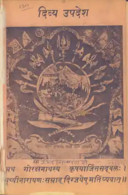 Divyopadesh (Nepali: दिव्योपदेश, lit.'Divine Counsel;[1] Divine Teachings[2]'), also Divya Upadesh, is a collection of teachings from Prithvi Narayan Shah, the founding monarch of the Kingdom of Nepal, as imparted by him to his courtiers and royal priests, toward the end of his life, around 1774–75.[3] It is also considered autobiographical as it contains accounts of his motivations and actions.[4] It was posthumously published for the first time in book form almost 180 years later, in 1952-53. Other versions of the book, at least one of them with reorganisation of sayings under different categories, have since been published. It is regularly cited by political commentators and politicians as a moral authority on the conduct of people and government, and guidance on domestic and foreign policies.[1][4] The collection of sayings delivered in the old Nepali dialect of the era is also considered to be of literary significance, and has been included in the course syllabus for Master of Arts (Nepali) program of Guwahati University, India. It is also considered the first work of essay of Nepali literature.